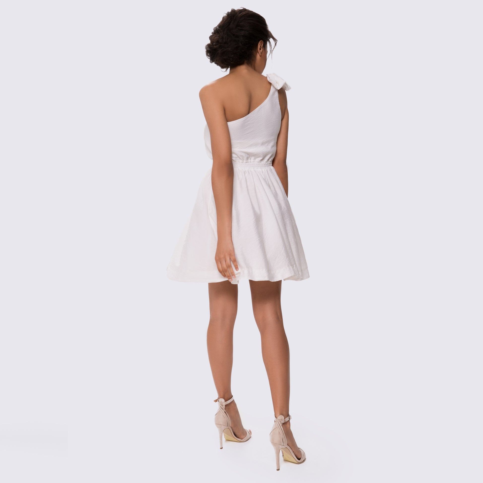 A charming white one shoulder mini dress designed for special occasions. This summer mini dress is sewn of a beautiful milky-white fabric, with an easy bruise effect and a slightly noticeable overflow of fabric. The fabric is very light and airy, fluffy skirt and a beautiful removable bow on the shoulder give this beautiful summer dress a romantic mood. The white dress is completely on a natural lining, it is fastened with a secret zipper on the side, the back belt is on an elastic band, which creates comfort when worn.